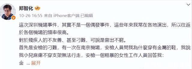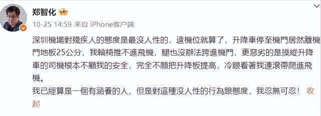当天下午,郑智化在社交媒体上发文,描述了自己在机场登机时遇到的困难。 他提到升降车平台与飞机舱门之间存在高度差,导致乘坐轮椅的他需要费力才能进入机舱。